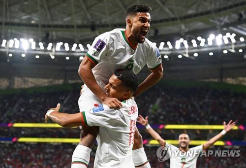 epa10332403 Abdelhamid Sabiri (bottom) of Morocco celebrates with teammate Yahia Attiyat Allah (up) after scoring the 1-0 lead during the FIFA World Cup 2022 group F soccer match between Belgium and Morocco at Al Thumama Stadium in Doha, Qatar, 27 November 2022. EPA/Georgi Licovski