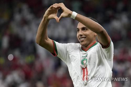 Morocco's Abdelhamid Sabiri celebrates after scoring his side's opening goal during the World Cup group F soccer match between Belgium and Morocco, at the Al Thumama Stadium in Doha, Qatar, Sunday, Nov. 27, 2022. (AP Photo/Christophe Ena)