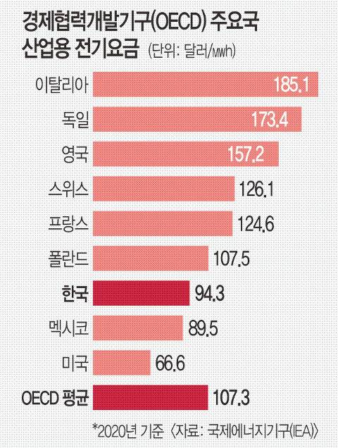 독일에선 산업용 전기요금이 ㎿h당 173.4달러로 녹색 프리미엄을 적용한 한국 산업용 전기요금보다 ㎿h당 70달러 이상 비싸다.