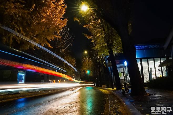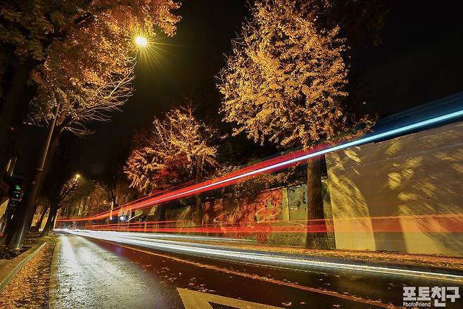 차량 후미등의 빨간 궤적과 가로등 불빛, 노란 은행잎 색감이 어우러집니다.