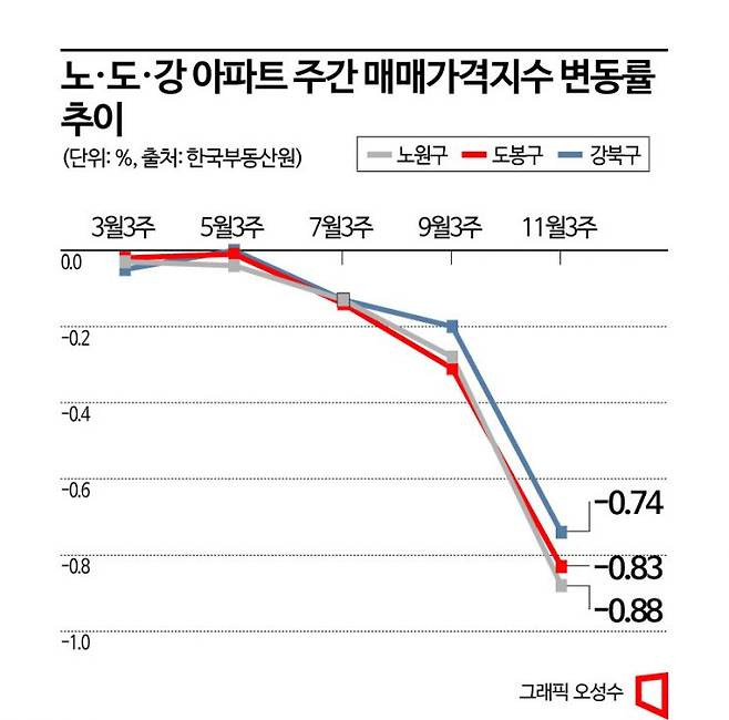 지난해에 비해 거래는 완전히 얼어붙은 모습이지만 급매 위주로 매물이 소화되면서 매매가격은 꾸준히 하락세를 보이고 있다. 서울부동산정보광장에 따르면 노·도·강의 지난해 9월 매매거래 건수를 합한 값은 342건이었지만, 올해 9월 70건으로 감소하며 전년 동월 대비 79.2% 감소했다.