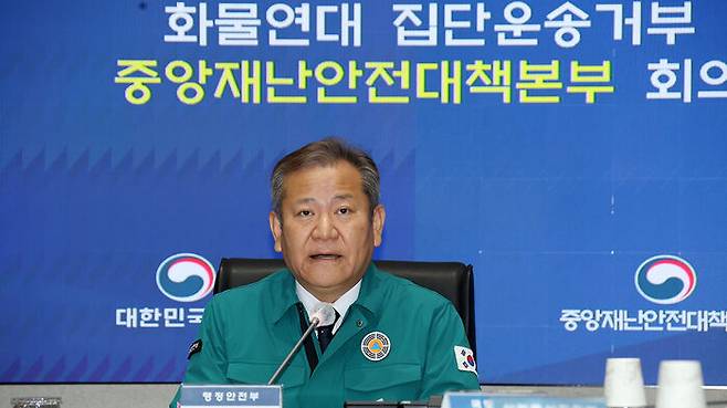 이상민 행정안전부 장관은 화물연대 파업 대응 방안을 논의하기 위해 오늘(28일) 오전 중앙재난안전대책본부 회의를 주재하고 "정부는 법과 원칙에 따라 무관용 원칙으로 강력히 대응해 나가겠다"며 이같이 밝혔습니다.