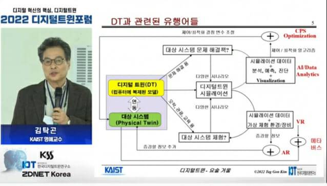 김탁곤 KAIST 명예교수는 25일 열린 '2022년 한국시뮬레이션 추계학술대회 및 제 4차 디지털트윈 포럼'에서 "디지털트윈이 디지털전환의 키"라며 이같이 밝혔다. 지디넷코리아가 후원한 이 행사는 시뮬레이션과 디지털트윈 관련 산학연 전문가들이 참석한 가운데 서울여자대학교 대학로캠퍼스에서 열렸다.