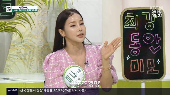 미나는 “지난 방송에서는 남편(류필립)과 나왔는데 기사도 엄청 많이 나고 많은 분들이 너무 동안이다, 예쁘다 해주셔서 기분이 좋았다. 오늘 운동으로 젊음을 유지하는 분들이 나온다 하는데 내가 빠지면 섭섭하다. 50대 대표 동안으로서 왕언니 노릇을 톡톡히 하려고 출연했다”고 말했다.