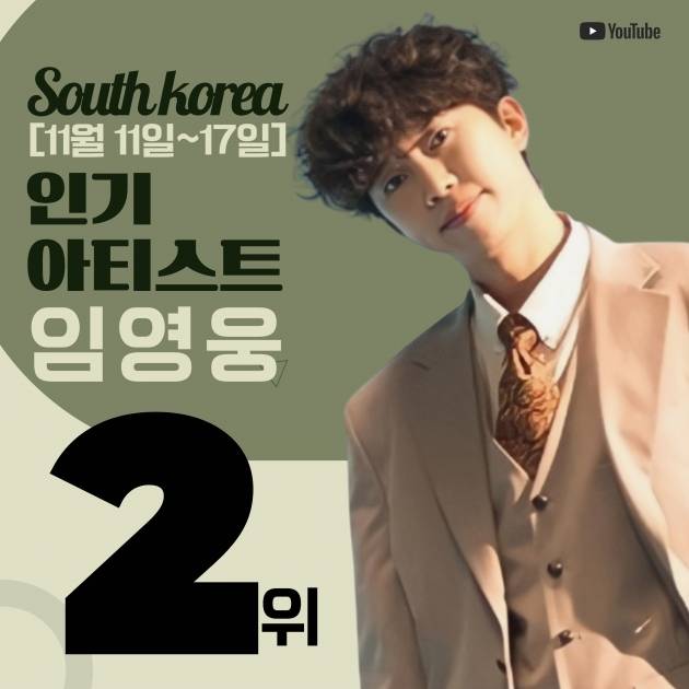 가수 임영웅이 유튜브 인기 아티스트 전체 TOP2를 남자 솔로가수로는 1위를 기록했다.