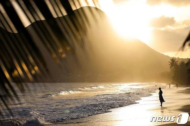 (마르티니크 AFP=뉴스1) 김예슬 기자 = 26일(현지시간) 카브리해에 있는 프랑스령 마르티니크섬의 다이아몬드 해변(Plage du Diamant)에 석양이 지고 있다. 22.11.26