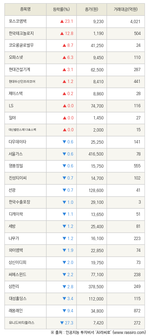 특히 포스코엠텍은 전 거래일 대비 23.1% 오른 9,230원에 거래를 마감하여 높은 관심을 받았다.