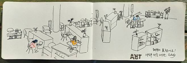 이 날은 미처 화구를 준비해 가지 않았지만 다행히 저널 북과 만년필이 있었다. 저널 북은 이럴 때 간단하게 스케치하기 좋다, 그리고 저널 북을 펼치면 긴 파노라마 구도가 되어서 특별한 느낌을 줄수 있다. 이 도서관은 모두 오픈되어 있는 구조이기 때문에, 2층 열람실에 가서 1층 아트 그라운드를 그렸다. 도서관에서 사람 그리기가 특히 좋은데 같은 자세를 오래 유지하기 때문이다.