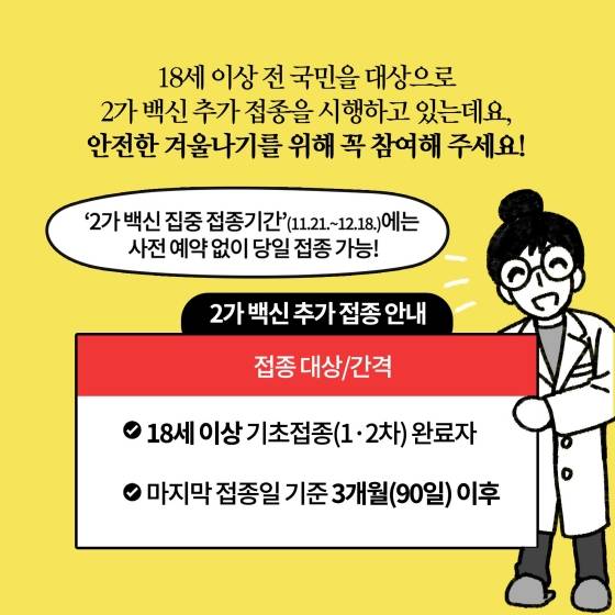 코로나19 방역상황이 겨울철 재유행 단계에 진입함에 따라 정부는 일상을 유지하면서도 안전하고 건강한 겨울나기를 위해 11월 21일부터 12월 18일까지 기존 백신보다 효과 좋고 안전한 2가 백신으로 집중 접종 기간을 운영하기로 결정했어요.