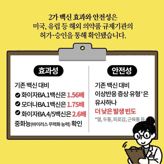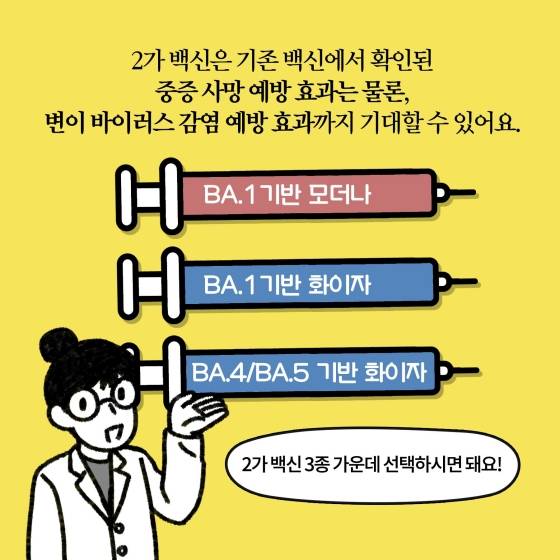2가 백신은 기존 백신에서 확인된 중증 사망 예방 효과는 물론, 최근 유행하는 변이 바이러스에 대한 감염 예방 효과도 기대할 수 있어요.