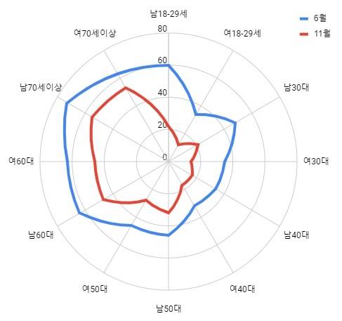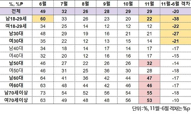 모든 성/연령대의 긍정률이 낮아진 탓에 6월보다 11월의 면적이 작아진 것으로 보인다. 더군다나 남녀 2030세대뿐 아니라 남녀 40대에서도 긍정률이 20% 내외로 상대적으로 낮아, 빨간색 선을 보면 차트 오른쪽이 거의 쪼그라들어 왼쪽으로만 면적을 유지하고 있는 것처럼 보인다. 남성 18~29세, 남성 30대에서도 어느 정도 긍정률을 볼 수 있는 파란색과 비교하면 정말 지나치게 위축된 모양새다.