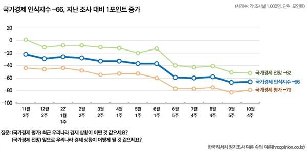 | ▲ 한국리서치 '여론 속의 여론' 10월 4주 국가경제 인식지수 역시 온라인으로 조사하는 한국리서치의 '여론 속의 여론'에서는 정기적으로 국가경제 인식지수를 포함하고 있다. 국가경제 평가를 보면 6월부터 좋지 않았다. |