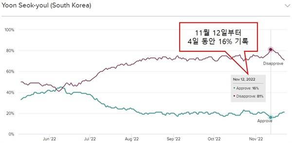 | ▲ 해외 여론조사 기관인 모닝컨설트가 주요 22개국 국가 지도자 긍/부정 평가를 발표하고 있다. 지난 12일부터 15일까지 윤석열 대통령은 16%를 연이어 기록했다. |