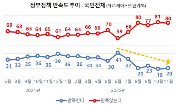 | ▲ 케이스탯 사회지표 11월 조사 정부정책 만족도 추이 케이스탯이 매달 온라인으로 조사해 발표하는 사회지표 여론조사의 정부정책 만족도 추이이다. 6월 41%를 고점으로 6개월 동안 하락해 지금은 20% 정도이다. |