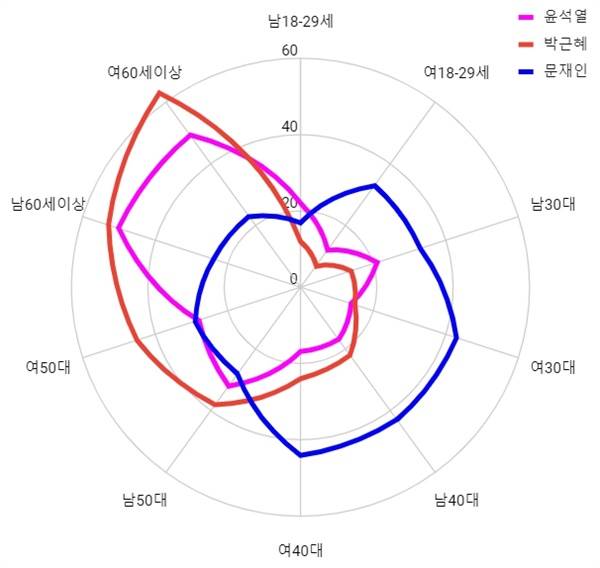 물론, 전·현직 대통령별로 나타나는 성/연령대별 분포 형태만으로 각 대통령의 최종적인 평가를 할 수는 없다. 당시의 정세적 역동성은 시기별로 달랐고, 연령대별로 지지하는 정당의 분포 역시 쏠림이 대조적으로 나타난다는 사실도 고려해야 한다.
