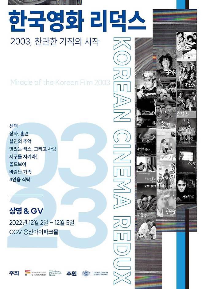 CGV는 2003년에 개봉한 화제작 8편을 모은 '한국영화 리덕스' 상영회를 오는 12월 2일부터 5일까지 CGV용산아이파크몰에서 진행한다고 28일 밝혔다.