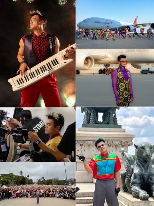박진영은 28일 'Groove Back' 프로젝트 비하인드 사진을 아낌없이 공개하고 K팝 팬들과 대중의 크나큰 관심과 사랑에 보답했다. 슈퍼주니어 신동, '애제자' 선미, 아시아나항공 직원들과 함께한 'Groove Back' 숏폼 댄스 콘텐츠에 이어 10월 8일 서울 남산을 춤 열기로 뜨겁게 달군 박진영이 이번에는 한국 너머에 그루브의 참맛을 알리기 위해 인천공항으로 향했다. 뮤직비디오 촬영 현장에서 포착한 박진영은 이색 컬래버를 펼친 아시아나항공 항공기 앞에 다시 선 모습. 보라색 시스루 셔츠, 현란한 패턴 의상을 입고 결의에 찬 듯 정면을 응시하거나 댄서들과 함께 흥겨운 신곡 포인트 안무를 추고 있어 시선을 붙잡았고, 기내 촬영에서는 진지한 표정으로 모니터링에 임하며 데뷔 29년 차 프로의 향기를 물씬 풍겼다.