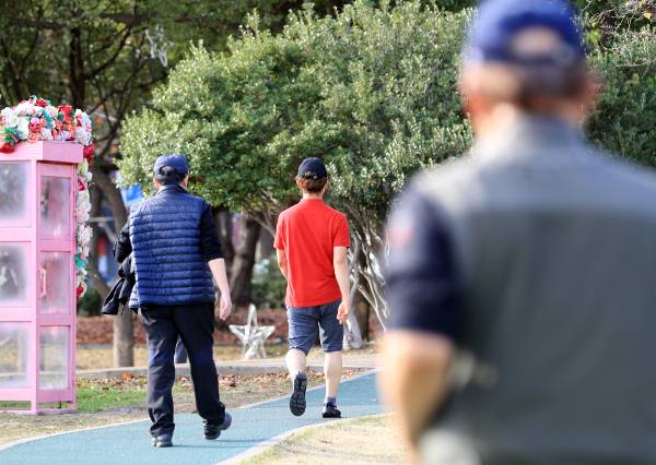제주 시민들이 28일 제주시 일도동 신산공원에서 반소매와 반바지 차림으로 산책하고 있다. 이날 제주지역 낮 최고기온은 평년(14.1도)보다 13.3도 높은 27.4도까지 올라 1923년 기상관측 이래 99년만에 최고치를 기록했다. 연합뉴스