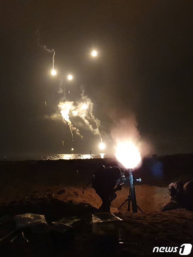 (포항=뉴스1) 최창호 기자 = 육군 제50보병사단이 28일 오후 경북 포항시 북구 송라면 화진훈련장에서 실시한 후반기 마지막 대규모 지해공 합동훈련에서 박격포 사격을 하고 있다.이날 훈련에는 수리온 공격헬기와 해군 고속정, 공군 KF-16, 해경함정 등이 참여해 육·해·공군 합동으로 해안으로 침투하는 가상의 적을 섬멸했다.(육군50사단제공)2022.11.28/뉴스1