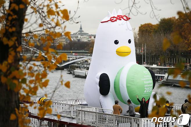 8미터 크기의 부산 갈매기 ‘부기’캐릭터가 탑재된 홍보선 ‘크루즈82’는 이날부터 29일 이틀간 파리 센 강에서 운영되며, 선내에는 박람회 주제를 담은 전시‧홍보 공간이 마련돼 있다. 2022.11.28/뉴스1
