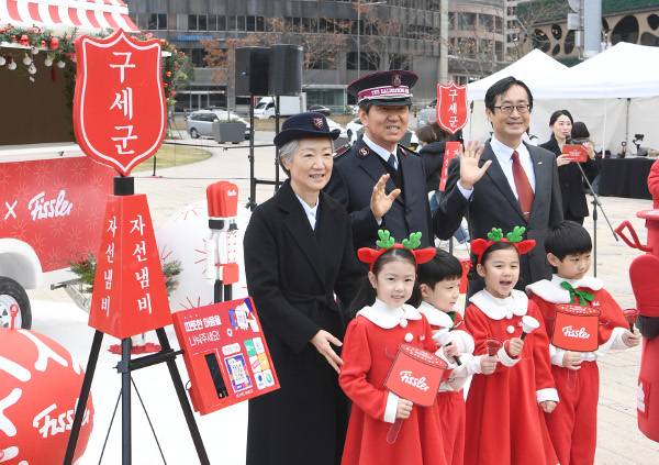 장만희(뒷줄 가운데) 한국구세군 사령관과 이경우(뒷줄 오른쪽 첫 번째) 휘슬러코리아 대표가 28일 서울 중구 서울광장에서 '한국구세군-휘슬러코리아가 함께하는 나눔카페 기증식'을 가진 뒤 어린이 모델들과 기념촬영을 하고 있다.
