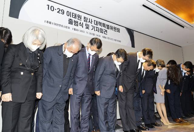 대한변호사협회가 28일 서울 용산구 몬드리안서울 이태원에서 '이태원 참사 대책특별위원회' 출범식을 열었다. 100명가량의 변호사가 참여해 참사 희생자와 유가족에 대한 법률지원을 한다. 이종협 변협 회장과 하창우 특별위원장 등 위원들이 고개 숙여 인사하고 있다.