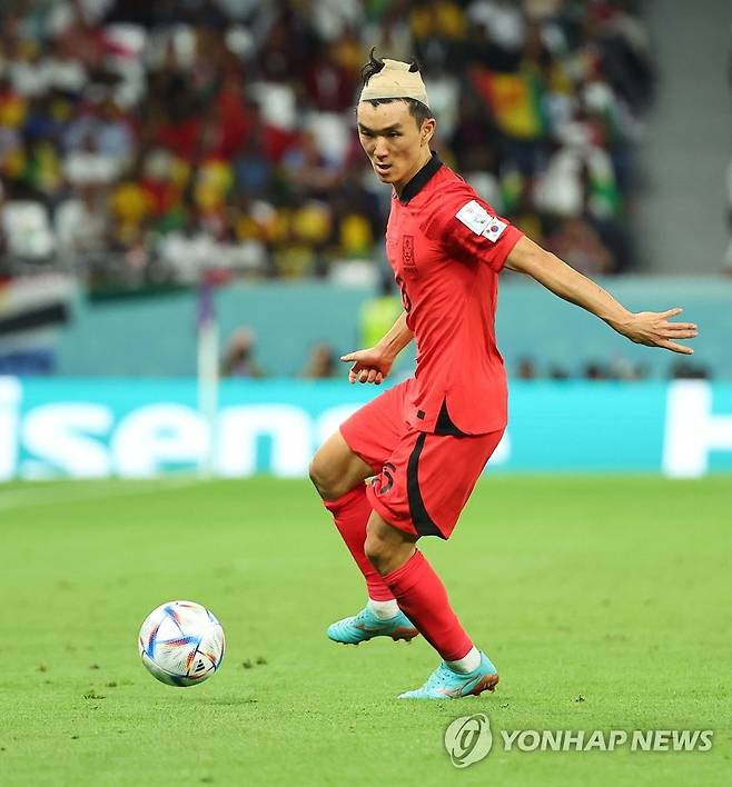 (알라이얀=연합뉴스) 김도훈 기자 = 28일 오후(현지시간) 카타르 알라이얀의 에듀케이션 시티 스타디움에서 열린 2022 카타르 월드컵 조별리그 H조 2차전 대한민국과 가나의 경기. 부상을 입은 황인범이 공을 따내고 있다. 2022.11.28