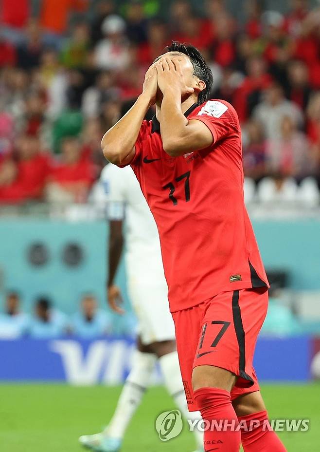 (알라이얀=연합뉴스) 김도훈 기자 = 28일 오후(현지시간) 카타르 알라이얀의 에듀케이션 시티 스타디움에서 열린 2022 카타르 월드컵 조별리그 H조 2차전 대한민국과 가나의 경기. 후반 한국 나상호가 슛이 빗나가자 아쉬워 하고 있다. 2022.11.28