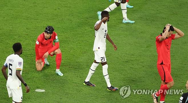 (알라이얀=연합뉴스) 김주성 기자 = 28일 오후(현지시간) 카타르 알라이얀의 에듀케이션 시티 스타디움에서 열린 2022 카타르 월드컵 조별리그 H조 2차전 대한민국과 가나의 경기. 대한민국 주장 손흥민이 후반전 골찬스를 놓친 뒤 아쉬워하고 있다. 2022.11.28