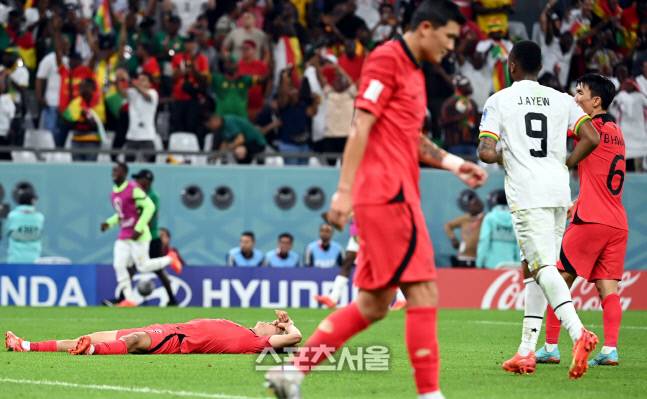 김진수가 28일 카타르 도하 에듀케이션 시티 스타디움에서 열린 2022 카타르 월드컵 조별리그 H조 2차전 가나와 경기에서 세 번째 골을 허용한 후 허탈해하고 있다.