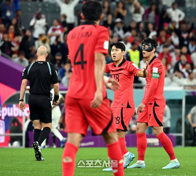 손흥민과 이강인이 28일 카타르 도하 에듀케이션 시티 스타디움에서 열린 2022 카타르 월드컵 조별리그 H조 2차전 가나와 경기에서 세 번째 골을 허용한 후 허탈해하고 있다.