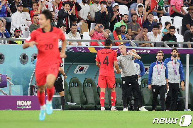 (알라이얀(카타르)=뉴스1) 이동해 기자 = 28일 오후(현지시간) 카타르 알라이얀 에듀케이션 시티 스타디움에서 열린 2022 카타르 월드컵 조별리그 H조 2차전 대한민국과 가나의 경기에서 김민재가 권경원과 교체, 벤투 감독의 격려를 받고 있다. 2022.11.28/뉴스1