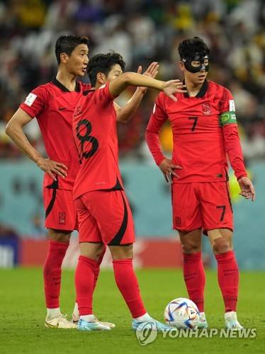 South Korea's Son Heung-min, right, with teammates prepare for a kick during the World Cup group H soccer match between South Korea and Ghana, at the Education City Stadium in Al Rayyan, Qatar, Monday, Nov. 28, 2022. (AP Photo/Julio Cortez)