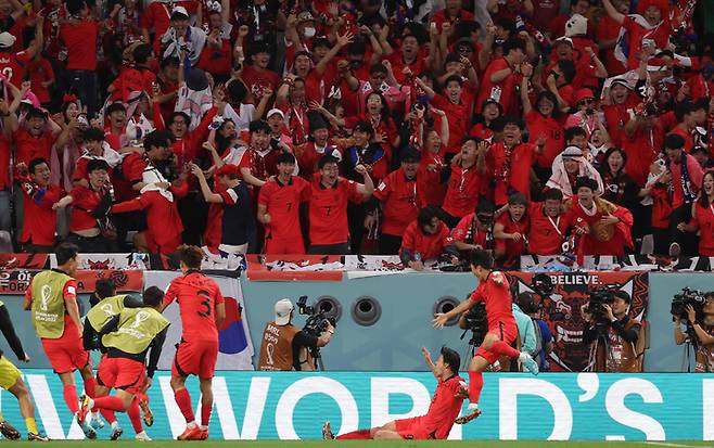 [알라이얀(카타르)=뉴시스] 백동현 기자 = 28일(현지시간) 카타르 알라이얀 에듀케이션 시티 스타디움에서 열린 2022 카타르 월드컵 H조 2차전 대한민국과 가나의 경기, 조규성이 동점골을 넣고 기뻐하고 있다. 2022.11.28. livertrent@newsis.com