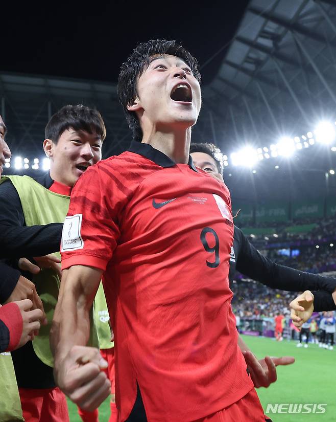[알라이얀(카타르)=뉴시스] 조성우 기자 = 28일(현지시간) 카타르 알라이얀 에듀케이션 시티 스타디움에서 열린 2022 카타르 월드컵 H조 2차전 대한민국과 가나의 경기, 조규성이 동점골을 넣고 세리머니를 하고 있다. 2022.11.28. xconfind@newsis.com