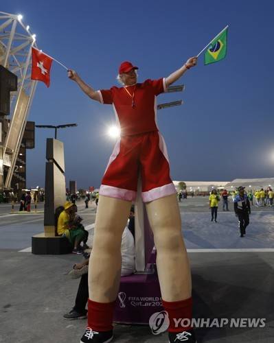 epa10334436 A person holds flags of Brazil and Switzerland ahead of the FIFA World Cup 2022 group G soccer match between Brazil and Switzerland at Stadium 947 in Doha, Qatar, 28 November 2022. EPA/Rolex dela Pena