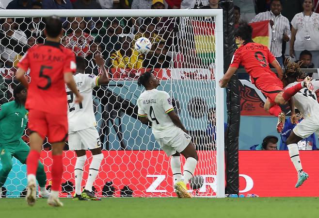 [알라이얀(카타르)=뉴시스] 백동현 기자 = 28일(현지시간) 카타르 알라이얀 에듀케이션 시티 스타디움에서 열린 2022 카타르 월드컵 H조 2차전 대한민국과 가나의 경기, 조규성이 동점골을 넣고있다. 2022.11.28. livertrent@newsis.com