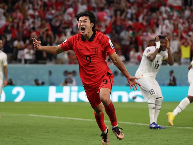 알라이얀(카타르)=뉴시스] 조성우 기자 = 28일(현지시간) 카타르 알라이얀 에듀케이션 시티 스타디움에서 열린 2022 카타르 월드컵 H조 2차전 대한민국과 가나의 경기, 조규성이 동점골을 넣고 세리머니를 하고 있다. 2022.11.28. xconfind@newsis.com