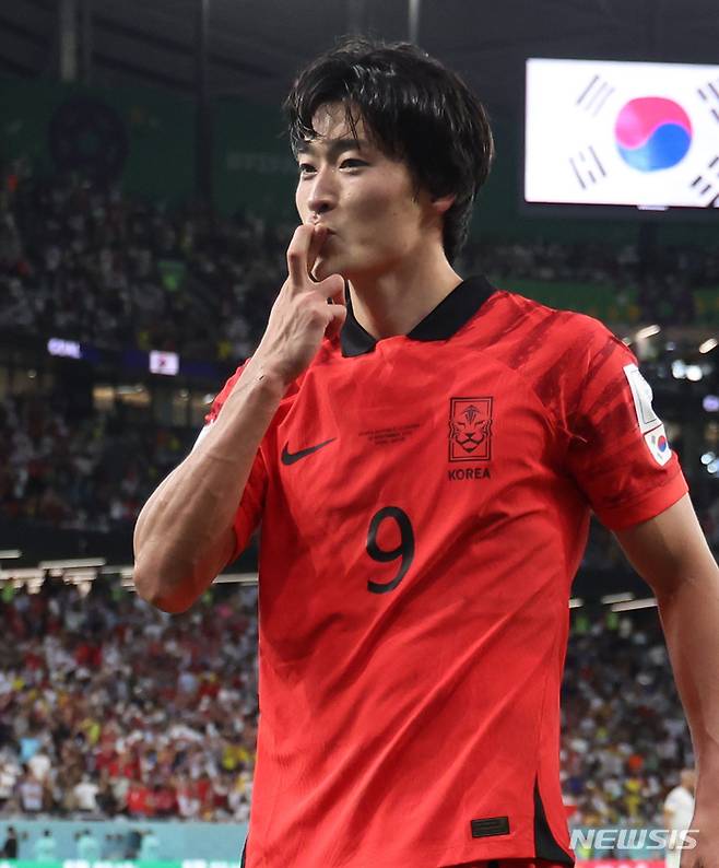 [알라이얀(카타르)=뉴시스] 조성우 기자 = 28일(현지시간) 카타르 알라이얀 에듀케이션 시티 스타디움에서 열린 2022 카타르 월드컵 H조 2차전 대한민국과 가나의 경기, 조규성이 동점골을 넣고 세리머니를 하고 있다. 2022.11.28. xconfind@newsis.com