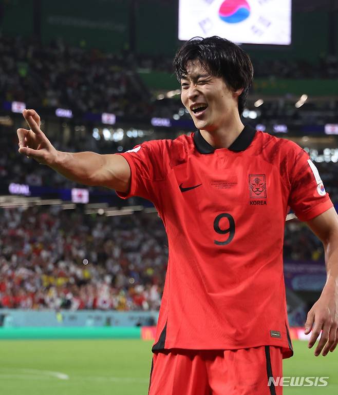 [알라이얀(카타르)=뉴시스] 조성우 기자 = 28일(현지시간) 카타르 알라이얀 에듀케이션 시티 스타디움에서 열린 2022 카타르 월드컵 H조 2차전 대한민국과 가나의 경기, 조규성이 동점골을 넣고 세리머니를 하고 있다. 2022.11.28. xconfind@newsis.com
