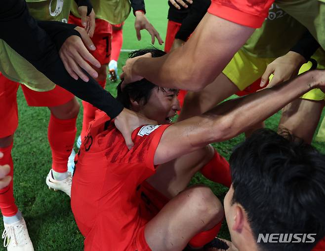[알라이얀(카타르)=뉴시스] 조성우 기자 = 28일(현지시간) 카타르 알라이얀 에듀케이션 시티 스타디움에서 열린 2022 카타르 월드컵 H조 2차전 대한민국과 가나의 경기, 조규성이 동점골을 넣고 선수들과 기뻐하고 있다. 2022.11.28. xconfind@newsis.com