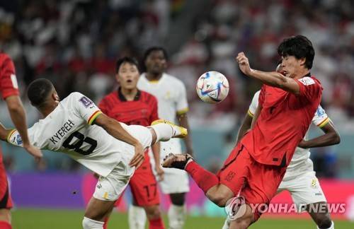 South Korea's Cho Gue-sung, right, duels for the ball with Ghana's Daniel-Kofi Kyereh during the World Cup group H soccer match between South Korea and Ghana, at the Education City Stadium in Al Rayyan, Qatar, Monday, Nov. 28, 2022. (AP Photo/Ricardo Mazalan)