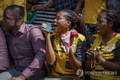 Ghana soccer fans react as they watch the World Cup group H soccer match between Ghana and South Korea, played in Doha, on a video screen erected outside the state broadcaster in the capital Accra, Ghana, Monday, Nov. 28, 2022 (AP Photo/Misper Apawu)
