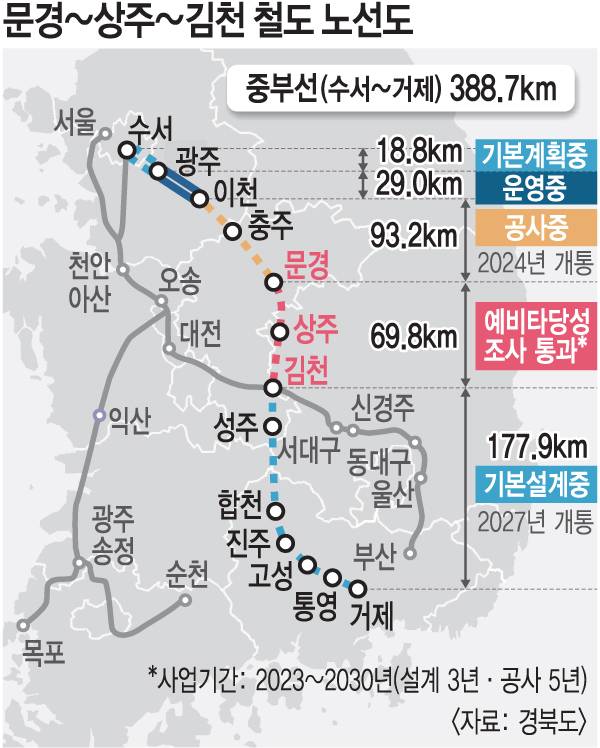 예타 통과를 계기로 본격적으로 추진되는 중부선 문경~상주~김천 철도는 단선전철 69.8㎞를 건설하는 사업으로 국비 1조3031억원이 투입된다. 수서∼문경 중부내륙철도와 김천∼거제 남부내륙철도 사이 미연결 구간(문경∼김천)의 철도를 연결하는 대형 국책사업이다. 사업기간은 2023년부터 2030년까지로, 차세대 고속열차 KTX-이음(최고속도 260㎞/h)이 운행 가능한 고속화노선으로 건설된다.