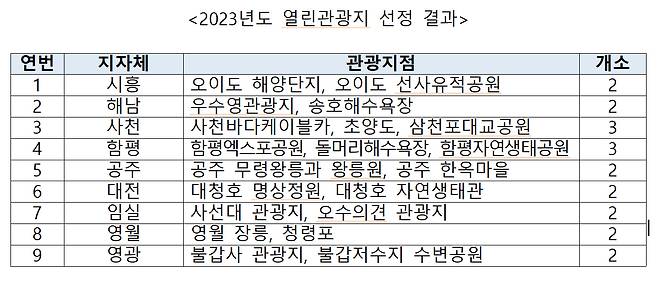 문화체육관광부와 한국관광공사는 '2023년 열린관광지 조성 사업' 지원 대상지로 대전의 대청호 명상정원 등 9개 관광권역의 관광지 20개소를 선정했다고 29일 밝혔다.