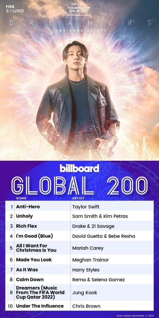 정국은 신곡 '드리머스'(Dreamers)로 주요 글로벌 차트 톱 10에 진입했다.