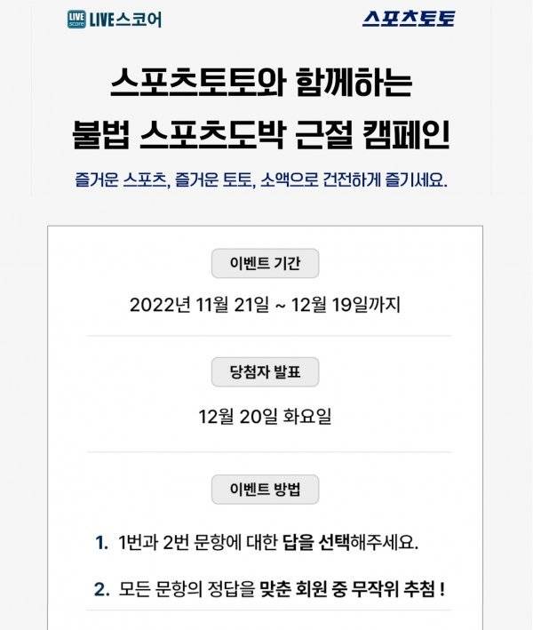 국민체육진흥공단에서 발행하는 체육진흥투표권 스포츠토토의 수탁사업자 스포츠토토코리아가 2022카타르월드컵 기간인 지난 21일(월)부터 다음달 19일(월)까지 라이브스코어와 공동으로 '불법스포츠도박 근절 캠페인'을 전개한다고 29일(화) 밝혔다.