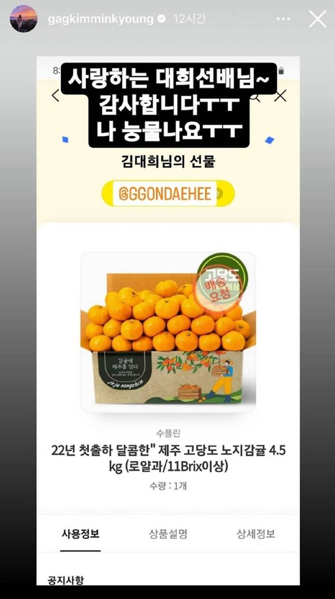 김민경은 선배 개그맨 김대희의 감귤 선물에도 "사랑하는 대희 선배님~ 감사합니다. 나 눈물 나요"라고 말했고, 선물을 보낸 다른 지인에게는 "누가 보냈는지 찾으려고 했는데 찾았다. 고마워~ 나 혼잔데"라고 감사 인사를 전했다.