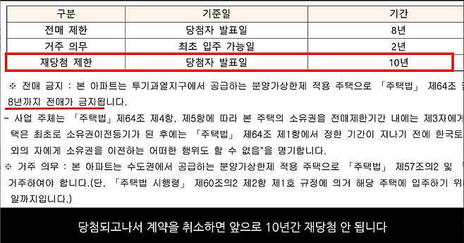 올림픽파크 포레온은 전매 제한 8년, 실거주 2년입니다. 당첨됐다고 바로 전세를 놓거나 판매할 수 없어요. 당첨되고 나서 계약을 취소하면 앞으로 10년간 재당첨 안 됩니다.