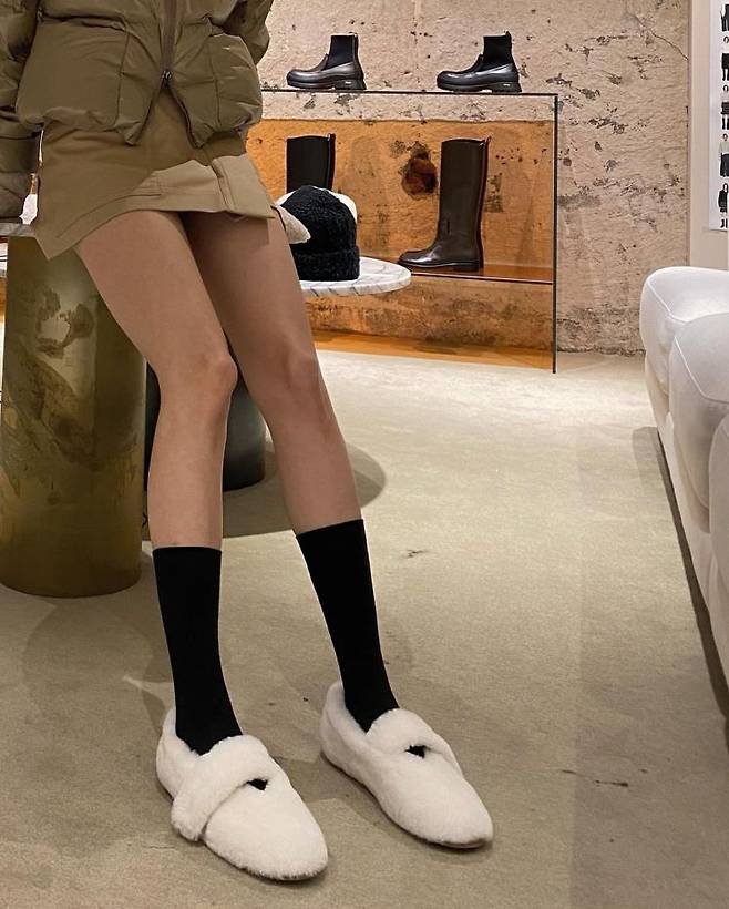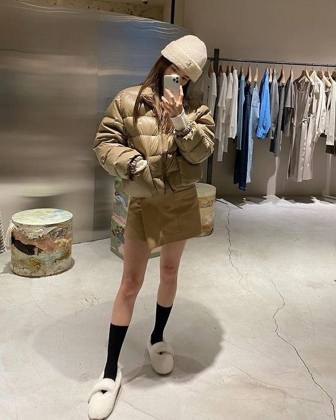 인플루언서 김수미는 비니, 패딩, 미니 스커트로 톤온톤 스타일링을 완성, 여기에 니삭스와 퍼 메리제인으로 포인트를 줘 귀여움을 한껏 살렸다. 퍼 메리제인만 있으면 미니스커트도 든든한 윈터룩이 된다는 이야기!